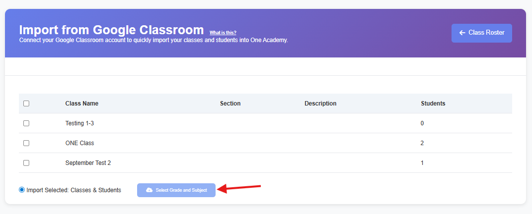 - Once you allow access and click continue, the system will search for any classes that you have within your Google Classroom and show them to you. Select the class you wish to import and click the "Select Grade and Subject button".