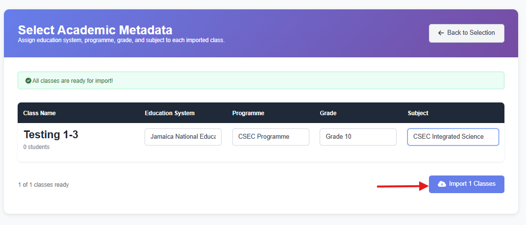 - Once you have finished selecting the class you'd like to import, click the "Import Classes" button at the bottom and give it a few minutes to notify that your class has been successfully imported and then you'll be able to see your students.