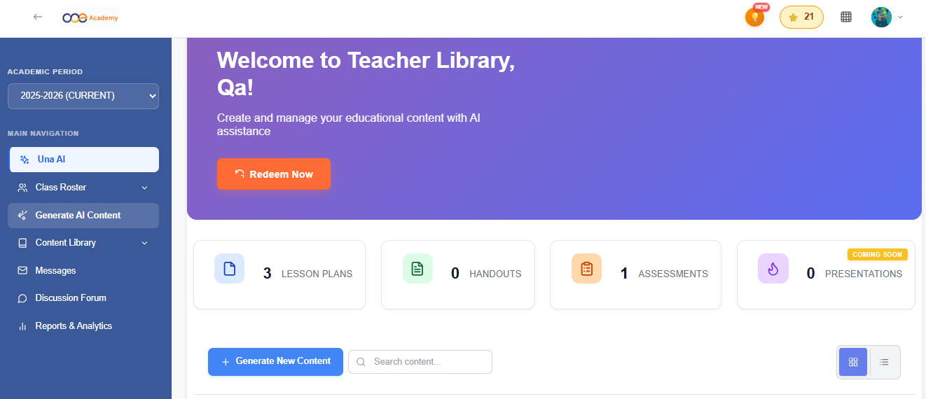 The AI Content Generator uses credits each time content is created. Here’s how to check your balance and add more: To View Your Current Credits: Log in to your One Academy account. Look at the top-right corner of the screen, you’ll see a gold star ...