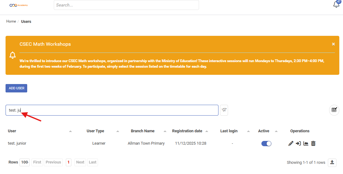 - Once you are on your school's dashboard, click the "Users" option on the left hand side of the screen